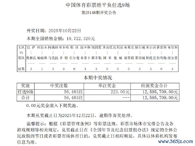 北京本领10月22日,赢输彩第25148期任九开奖效果揭晓。本期任九开出56483注,单注奖金223元。本期任九总投注额19,722,320元。